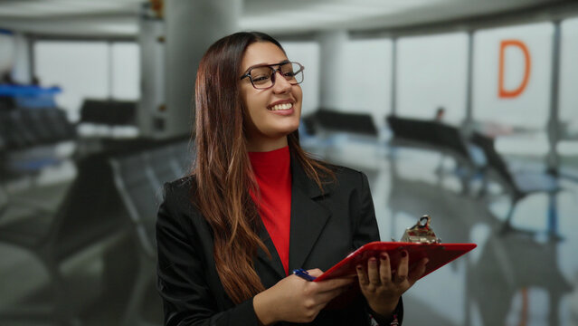 Woman smiling while holding a red clipboard in an airport terminal setting, capturing the essence of travel and business interaction in a professional indoor environment.