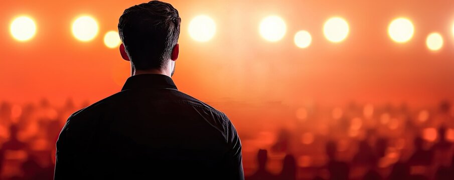 Business travel conference itinerary concept. A silhouette of a man stands before a crowd, illuminated by warm stage lights, creating an atmosphere of anticipation and focus.
