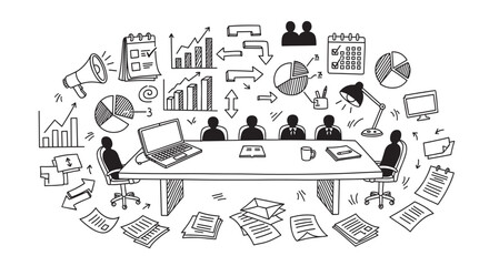 Hand-drawn doodle illustration of a corporate business meeting with people at a conference table surrounded by charts, graphs, and office icons representing strategy and planning