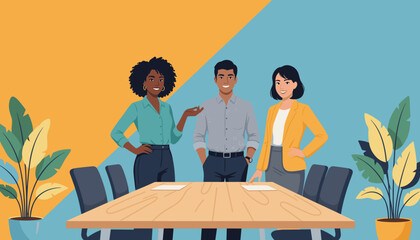 Diverse business team ready for a meeting Smiling professionals standing confidently at a conference table
