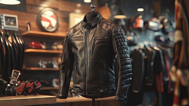 Motorclothes collection includes a stylish biker leather jacket displayed in a retail shop, emphasizing the craftsmanship and design. The biker leather jacket is perfect for riders.