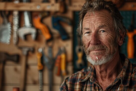 Portrait of a carpenter with tools, highlighting his craftsmanship and dedication.