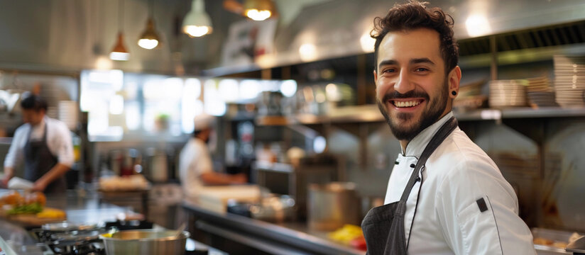 Positive busy indian male business owner in apron looking at camera in cafe kitchen