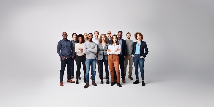 Diverse startup crew striking individual full length poses, confidently facing the camera against a stark white backdrop, concept of Multicultural team