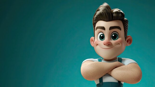 Friendly cartoon handyman, arms crossed, teal background, service advert