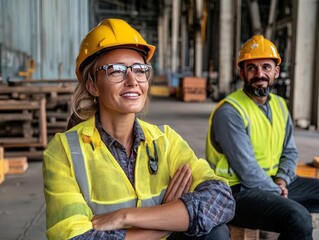 confident female construction worker wearing hard hat and safety gear, showcasing determination and professionalism in her role