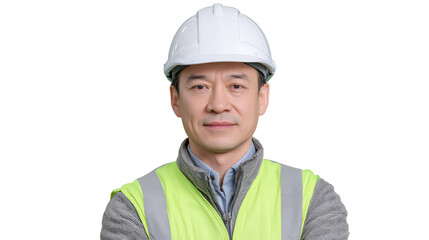 A confident male construction worker in a helmet and safety vest, showcasing professionalism and dedication in his trade.