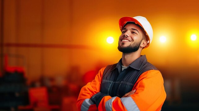 Skilled worker wearing safety gear in modern workshop, showcasing confidence and professionalism