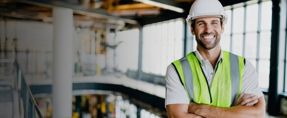 Smiling male construction worker wearing yellow hard hat and vest stands confidently in modern warehouse environment showcasing teamwork and professionalism in industrial settings