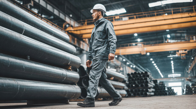 A confident male industrial worker, wearing hard hat, protective uniform, is shown walking down aisle of factory, surrounded by stacks of metal pipes, highlighting themes of logistics, heavy industry