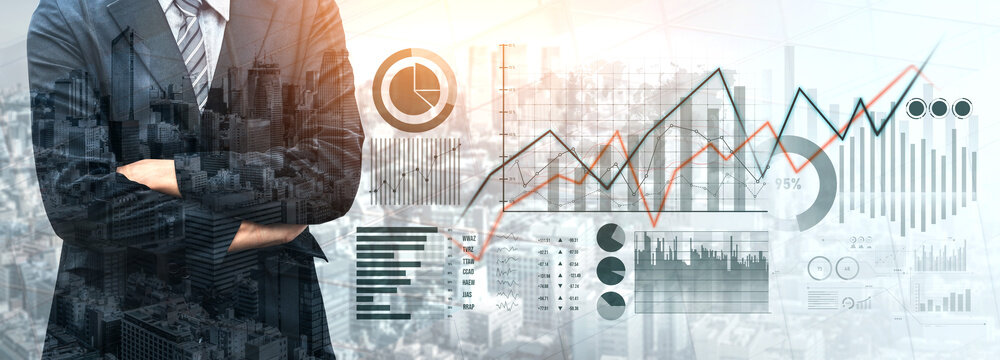 Confident businessman in a suit with crossed arms stands before a city skyline, surrounded by dynamic data visualizations highlighting financial trends and growth opportunities. Scalp