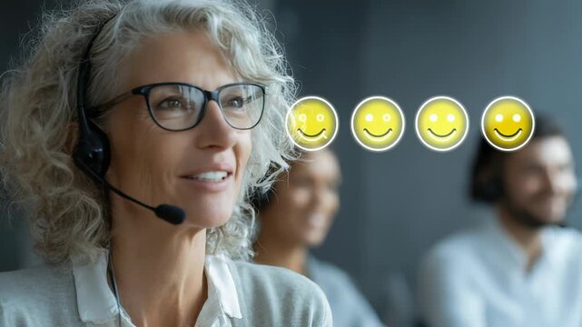 Confident mature woman in glasses and headset delivers outstanding customer experience at a call center. Bright smiley icons highlight exceptional service quality and successful communication