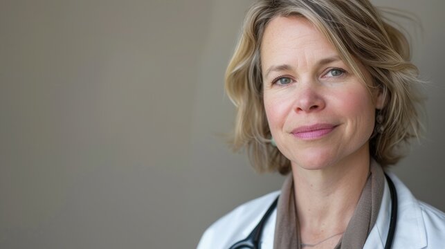 Headshot portrait of a confident middle-aged female doctor or professional with short blonde hair and a stethoscope, smiling slightly at the camera