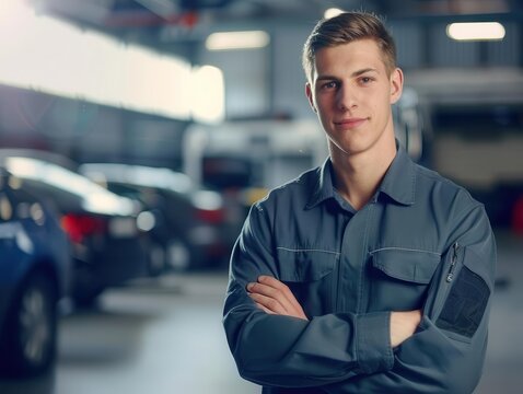 confident male auto mechanic in modern hightech garage crisp uniform contrasts with advanced diagnostic equipment and gleaming vehicles in background