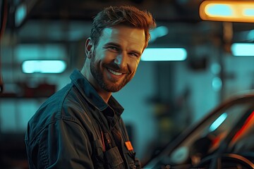 Smiling mechanic working on a car. This image is perfect for advertising car repair services and highlighting the friendly and professional nature of your business.
