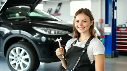 A professional female mechanic holding a wrench, smiling warmly in a brightly lit auto shop, with a sleek black car elevated on a hydraulic lift in the background