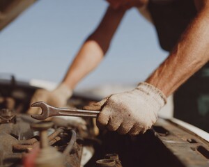 Professional Auto Mechanic Repairing Car Engine with Wrench in Workshop High-Quality Technical Support for Modern Automotive Marketing and Social Media