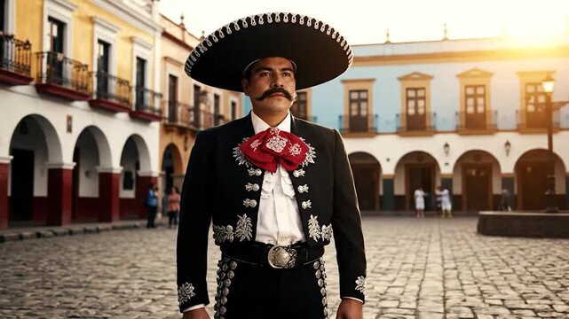 Mexican Mariachi Man in Traditional Sombrero and Suit Standing in a Historic Town Square at Sunset.