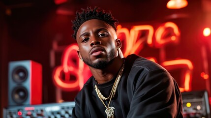 A talented performer captivates the audience with his presence, embodying passion and confidence in a visually striking studio illuminated with neon lights.