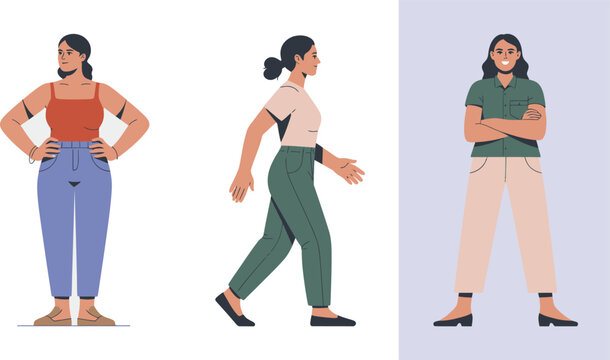 Three women are depicted in various confident and casual poses including standing and walking