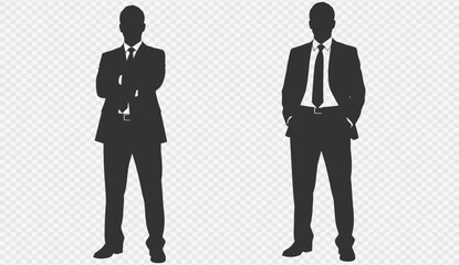 Two businessmen standing in formal attire with different postures against a transparent background