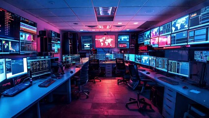 Security room with computers, stock market data and stock exchange data. CCTV cameras in surveillance room. Cybersecurity concept.