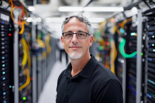 Confident IT professional in a modern server room, symbolizing expertise in technology, data management, and cybersecurity solutions