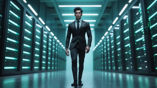 Professional businessman in a sleek suit confidently walking through a high-tech server room. The space is illuminated by glowing green and blue lights, symbolizing innovation and technology.