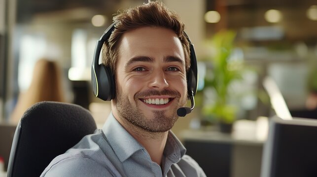 Confident and cheerful customer service representative, headset on, customer-friendly office environment