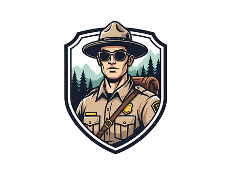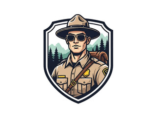 Vintage pin-up style male park ranger vector illustration in uniform, confident stance, flat solid colors, clean outlines, forest landscape background, nature logo badge, poster ready