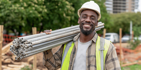 African american construction worker wearing hard hat and safety vest smiling carrying metal pipes on site
