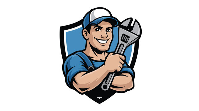 Confident male plumber or repairman with a happy grin holding a wrench inside a stylized shield icon