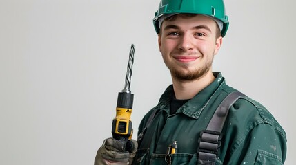 Confident young worker in green uniform holding a drill. smiling tradesman with safety helmet. professional at work portrait. AI