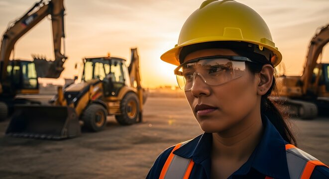 Confident construction worker at sunset with heavy machinery background. Wearing yellow hardhat and safety glasses. Focused expression, warm lighting.