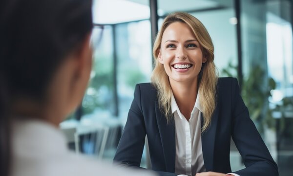 Confident young businesswoman in orange blazer smiling during a job interview with two recruiters in a modern office setting