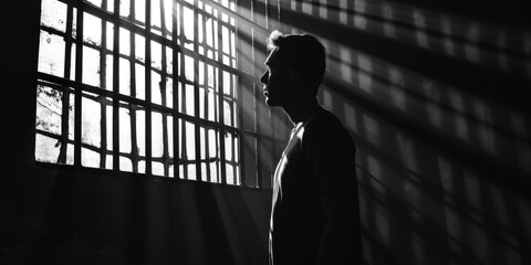 A man is seen standing in front of a window in a jail cell. This image can be used to depict the feeling of confinement or imprisonment