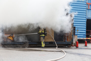 Firefighter holding hose and spraying water
