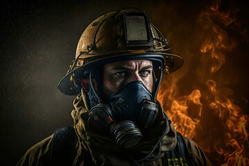 close up fireman with hard hat, fire and flames or conflagration in background, in darkness. Generative AI
