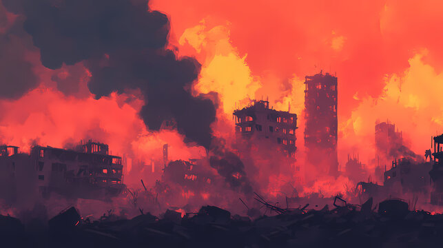 Devastated urban landscape: smoke and flames rise over a war-torn city, highlighting the impact of conflict and destruction on infrastructure and communities. Echoing Loss. Illustration
