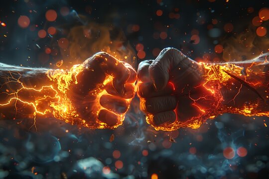 Two powerful fists painted with Russia and EU flags collide with sparks and fire particles, dark smoky background emphasizing intense geopolitical conflict