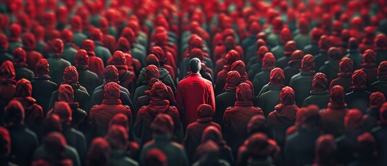 A sea of conformity met by one defiant leader, stark against the multitude in red
