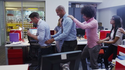 Black vector silhouette of group of people dressed in late 1950s early 1960s fashion dancing conga line, no white objects, EPS 8