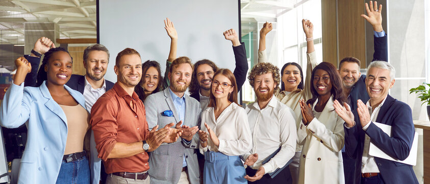 Portrait of diverse happy business people standing in office applauding and looking cheerful at the camera. Group of coworkers men and women smiling indoors. Team work concept. Banner.