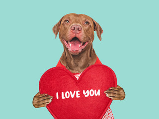 I Love You. Lovable dog and congratulatory inscription. Closeup, indoors. Studio shot. Congratulations for family, relatives, loved ones, friends and colleagues. Pets care concept