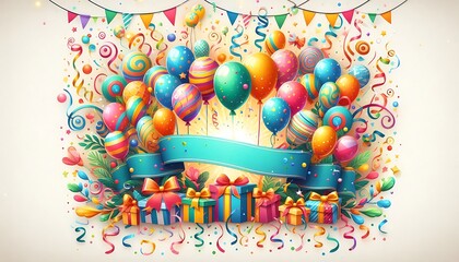 A festive celebration scene with gold balloons, shimmering confetti, and vibrant colors perfect for a birthday, party, or congratulatory event design.