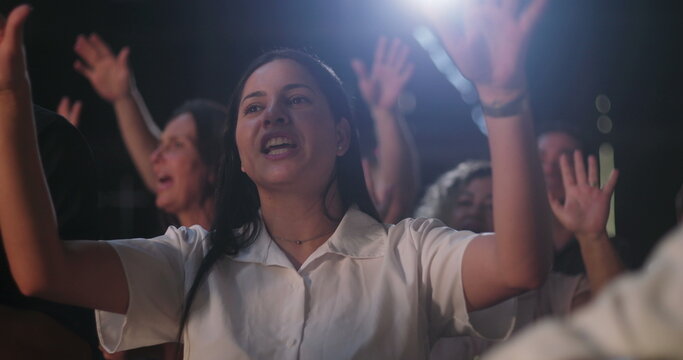 Woman raising hands in spiritual praise during evangelical worship service, joyful expression, white shirt, diverse congregation with hands lifted in celebration of faith