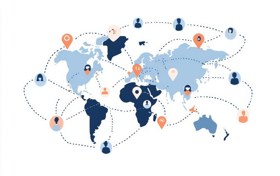 A world map dotted with AI icons and customer service avatars, connected by data lines symbolizing the efficiency of global outsourcing strategies