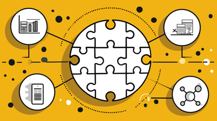 Illustration puzzle center linked to icons symbolizing data, technology, analysis