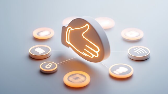 A 3D rendered image featuring a central glowing handshake icon connected to various other icons, symbolizing c