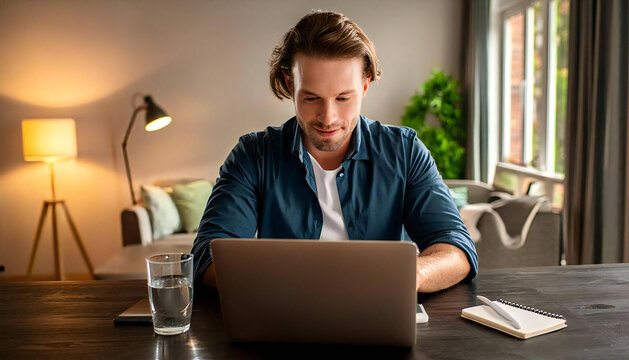 A young man operating a laptop. Image material of a young, smiling man operating a laptop.
